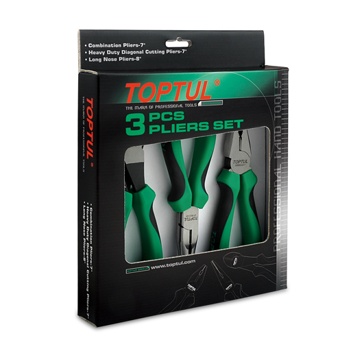 Set Contains:7″ Combination Pliers7″ Heavy Duty Diagonal Cutting Pliers8″ Long Nose Pliers